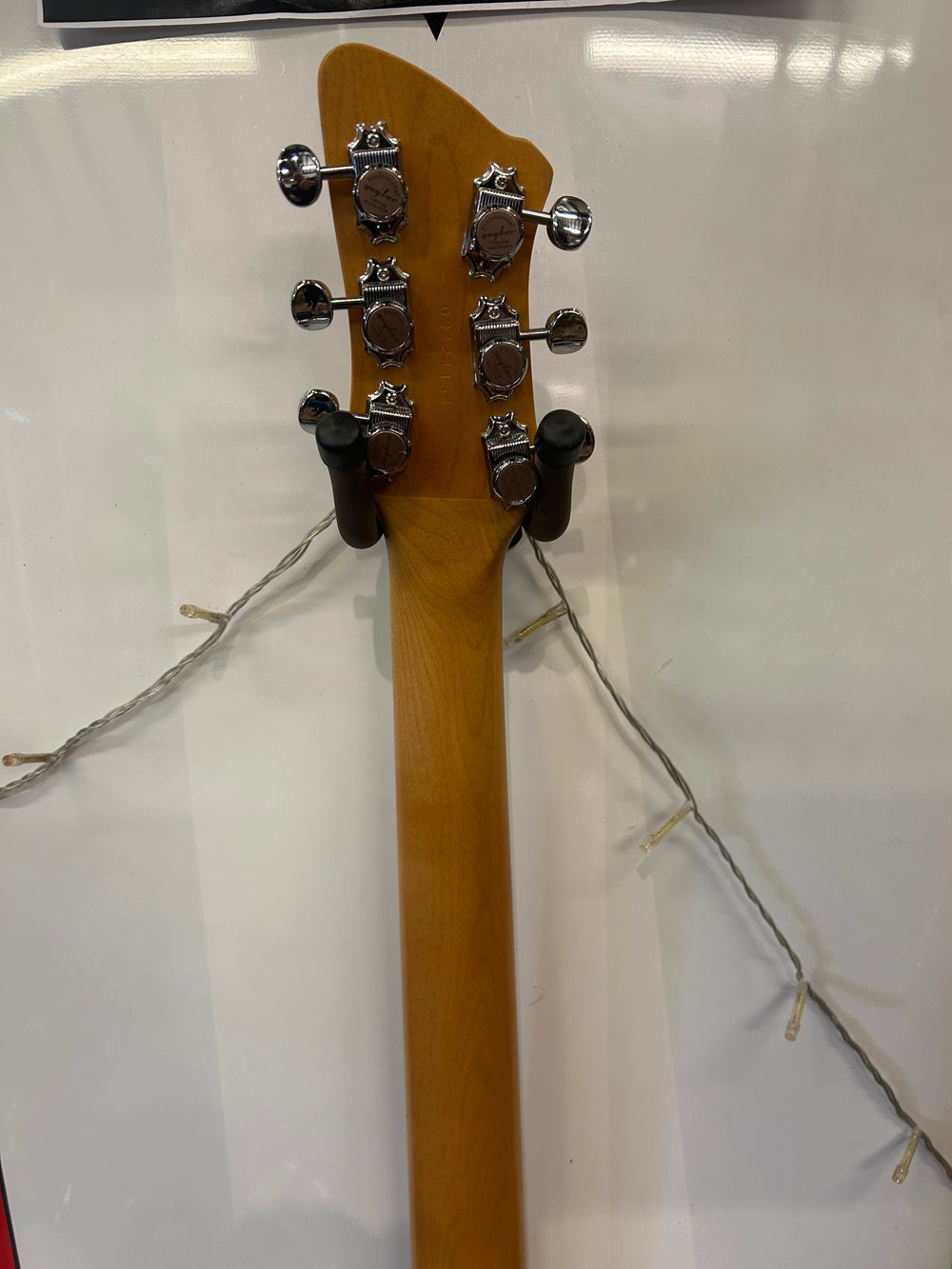 The guitar is semi-hollow with a silver leaf maple center block and poplar wings, making it lightweight despite its thickness.